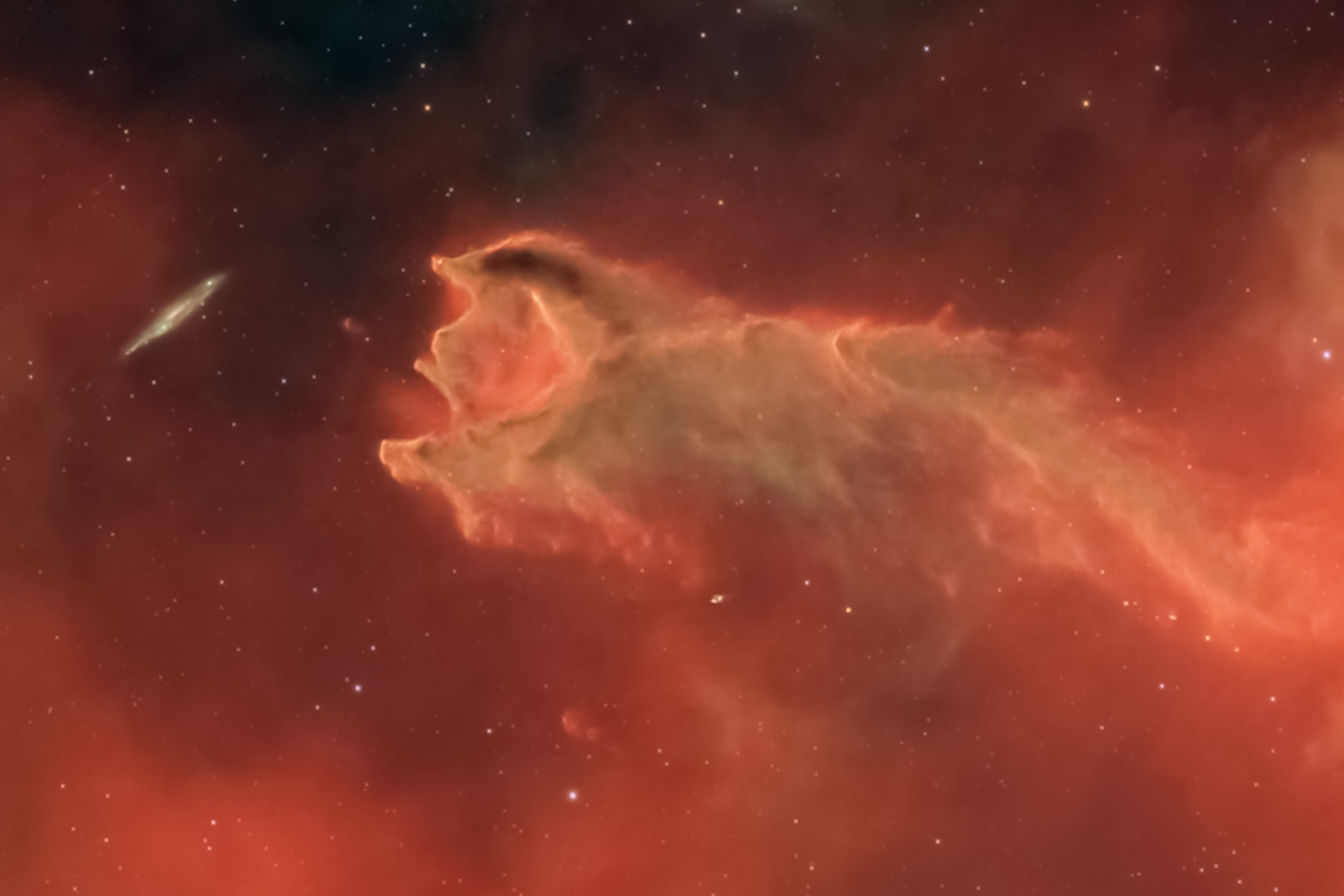 في أعماق الفضاء المظلم، يبرز سديم “فم الوحش” كوحش أحمر عائم بين النجوم، مشهداً شبيهاً بأفلام الخيال العلمي. يقع هذا “الحضانة النجمية” على بعد 1300 سنة ضوئية في كوكبة الكوثل، حيث يتجمع غاز الهيدروجين البارد لتوليد نجوم جديدة، كأن الكون ينسج حياة جديدة في خضم الظلام.