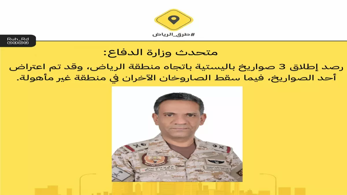أكد اللواء الركن تركي المالكي، المتحدث الرسمي لوزارة الدفاع، أن قوات الدفاع رصدت إطلاق ثلاثة صواريخ باليستية باتجاه الرياض، مشيراً إلى نجاح المنظومة في تدمير صاروخ واحد فقط من بين الثلاثة.
