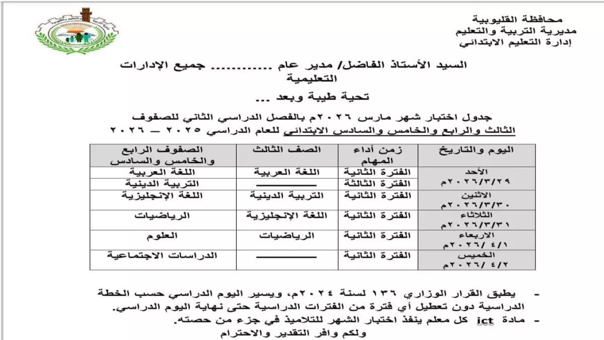تستهدف الامتحانات الشهرية طلاب الصفوف من الثالث إلى السادس الابتدائي، وستُجرى اختبارات اللغة العربية يوم السبت 28 مارس 2026. تلي ذلك امتحانات الرياضيات لطلاب الصف الثالث يوم الأحد، بينما يخوض طلاب الصفوف الرابع والخامس والسادس اختبارات اللغة الإنجليزية والتربية الدينية في اليوم نفسه.