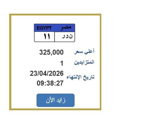 أعلنت بوابة مرور مصر الإلكترونية عن بدء المزاد على لوحة معدنية مميزة للسيارات، والتي وصل سعرها حتى الآن إلى 325 ألف جنيه، وتحمل الرقم «ن ى ن 11»، مع وجود شخص واحد يتزايد عليها حالياً، وتستمر المزايدة حتى يوم الخميس 23 أبريل 2026.