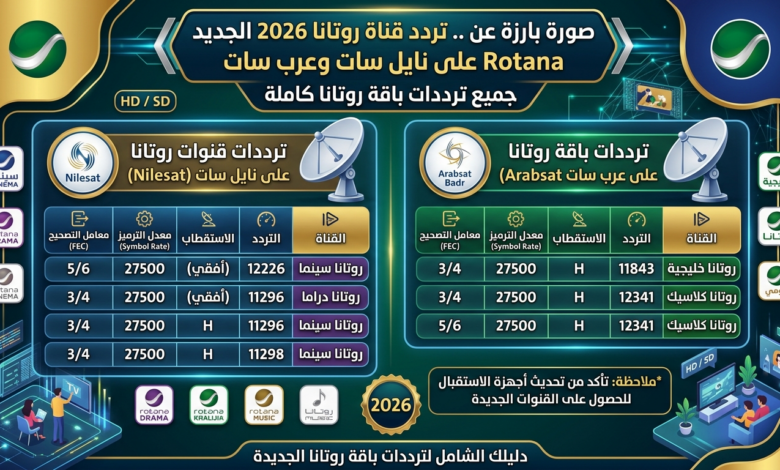 اكتشف ترددات باقة روتانا الجديدة 2026 على نايل سات وعرب سات بكل سهولة