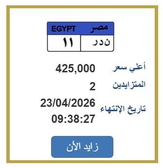 تقدّم بوابة مرور مصر الإلكترونية فرصة فريدة لاقتناء لوحة معدنية مميزة للسيارات، حيث وصل سعر إحدى اللوحات المميزة التي تحمل الرقم «ن د ر 11» إلى 425 ألف جنيه، ويتنافس عليها حتى الآن شخصان، على أن تنتهي المزايدة يوم الخميس 23 أبريل 2026.