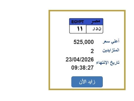 أعلنت بوابة مرور مصر الإلكترونية عن بدء مزاد لبيع لوحة معدنية فريدة للسيارات، حيث بلغ سعرها الحالي 525 ألف جنيه، وتحمل الرقم «ن د ر 11»، ويتنافس عليها حالياً شخصان، ومن المقرر أن ينتهي المزاد اليوم الخميس 23 أبريل 2026.