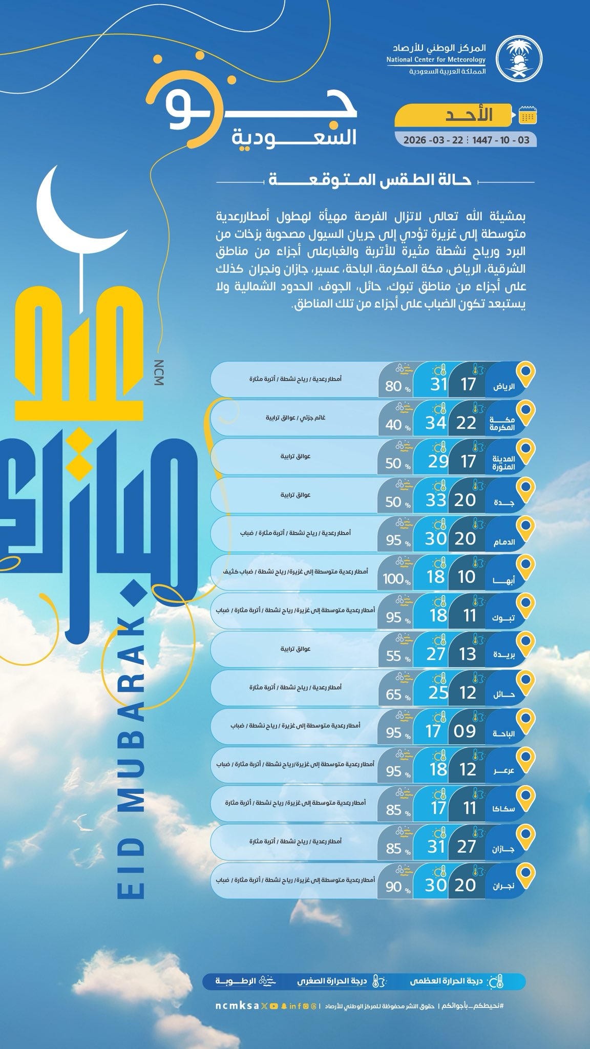 أعلن المركز الوطني للأرصاد في تقريره اليومي أنه من المتوقع، بمشيئة الله، استمرار هطول الأمطار الرعدية المتوسطة إلى الغزيرة على عدة مناطق في المملكة، بما في ذلك الشرقية، الرياض، مكة المكرمة، الباحة، عسير، جازان ونجران، بالإضافة إلى بعض المناطق من تبوك، حائل، الجوف والحدود الشمالية.