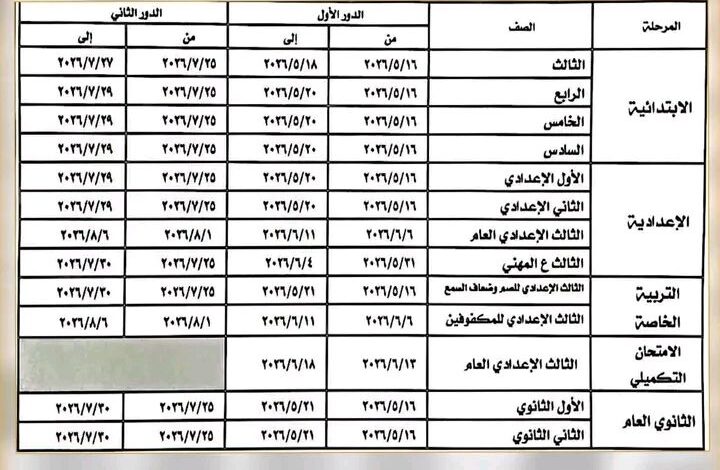 تبدأ امتحانات المرحلة الابتدائية في الفترة من 16 إلى 20 مايو 2026. أما بالنسبة للمرحلة الإعدادية، فإن الامتحانات ستبدأ من 16 مايو وتستمر حتى 11 يونيو 2026. بالنسبة للصفين الأول والثاني الثانوي، ستجري امتحاناتهم أيضاً خلال الفترة من 16 إلى 21 مايو 2026. هذه المواعيد تتيح للطلاب الاستعداد الجيد وتحقيق أفضل نتائج ممكنة.