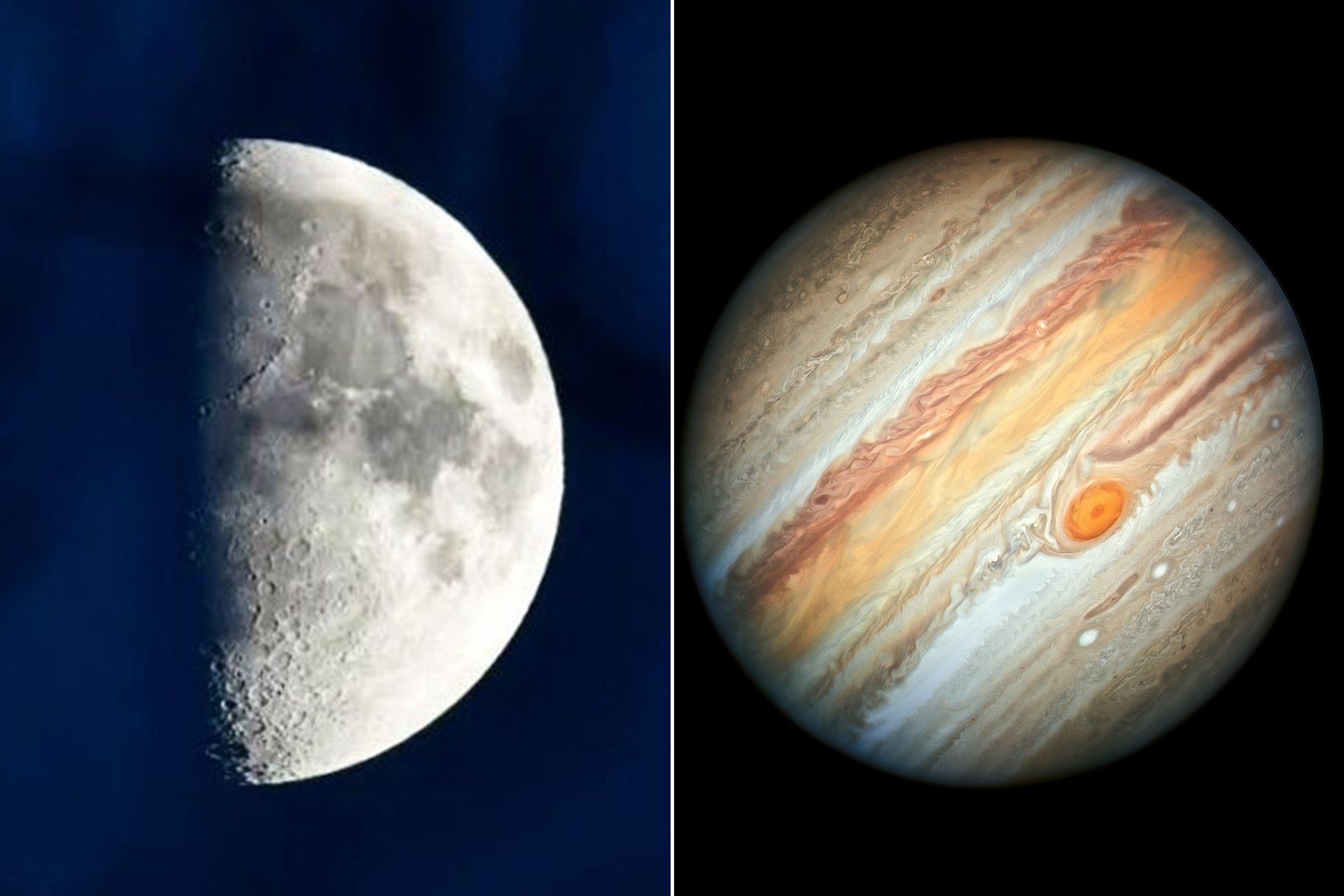 دائماً ما يُنظر إلى المشتري، العملاق الغازي، كشىء متحرك، حيث يدور حول الشمس في دورة مدتها نحو 12 سنة، ومعه مجموعة من الأقمار، من بينها أربعة أقمار تُعرف بأقمار غاليليو: “غانيميد” و”كاليستو” و”آيو” و”يوروبا”، مما يضفي عمقاً إضافياً على حركة النظام الشمسي. ويتنقل القمر كل شهر عبر البروج، لكن هذه المرة يظهر في موقع مثالي أمام المشتري.