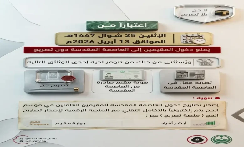 أعلنت وزارة الداخلية عن بدء تنفيذ حظر دخول العاصمة المقدسة اعتباراً من 13 أبريل 2026، حيث لن يُسمح لأي مقيم بدخول مكة المكرمة إلا بمن يحمل تصريحاً رسمياً، في إجراء يهدف إلى تنظيم الحركة بصورة أكثر صرامة قبيل موسم الحج 1447هـ.