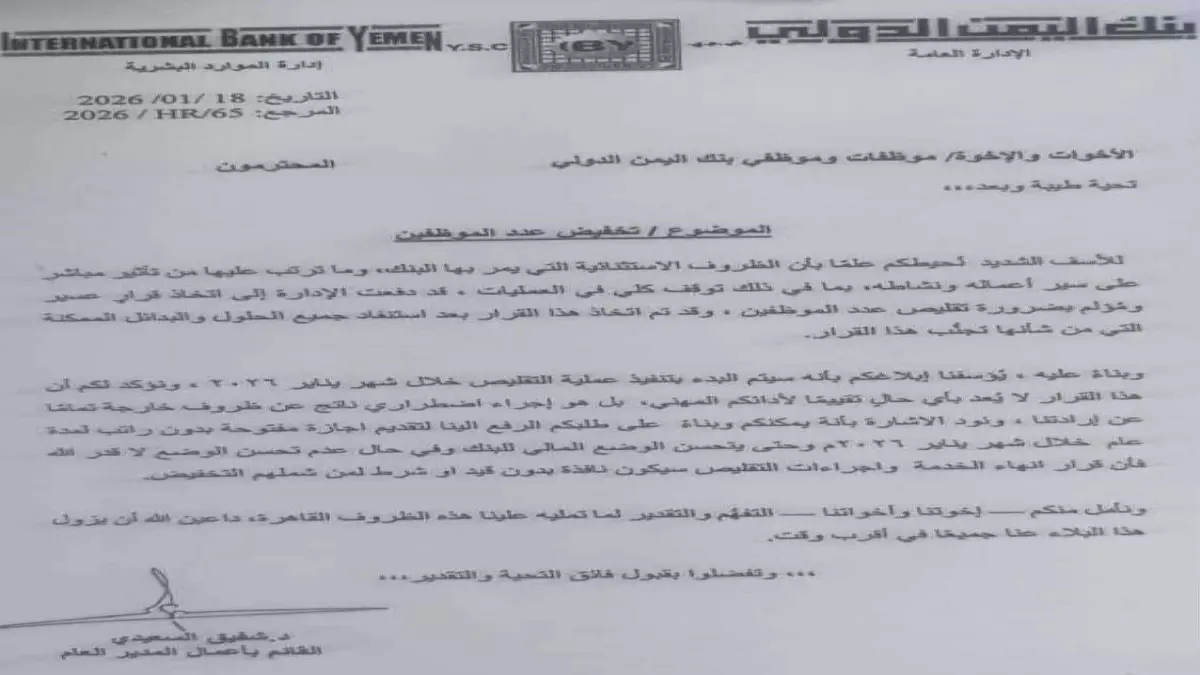 وقد كشف تعميم داخلي مؤرخ في 18 يناير 2026م، والذي وقعه د. شفيق السعيدي القائم بأعمال المدير العام، عن انهيار شبه كامل لنشاط البنك، حيث أدت الظروف الاستثنائية إلى توقف جزئي في بعض جوانب العمليات المصرفية، مما دفع الإدارة لاتخاذ إجراءات تسريح واسعة النطاق.