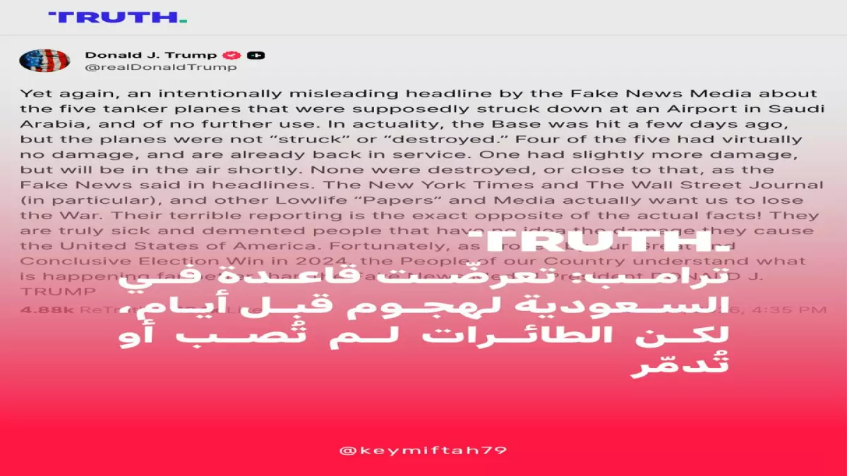 جاء ذلك عقب تقارير مضللة زعمت تدمير خمس طائرات تزويد بالوقود أمريكية في قاعدة جوية بالمملكة العربية السعودية، حيث نفى ترامب هذه المعلومات بشكل قاطع وقدم حقائق مختلفة تماماً.