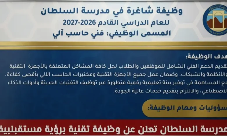 أعلنت مدرسة السلطان في سلطنة عمان عن فتح باب التوظيف لوظيفة فني حاسب آلي، حيث تركز المدرسة على إدماج أدوات الذكاء الاصطناعي في البيئة التعليمية الرقمية. هذه الخطوة تمثل بداية جديدة للعام الدراسي 2026-2027، وتأتي ضمن جهود عمان الدؤوبة لتعزيز التعليم من خلال تبني التقنيات الحديثة.
