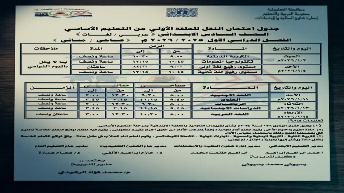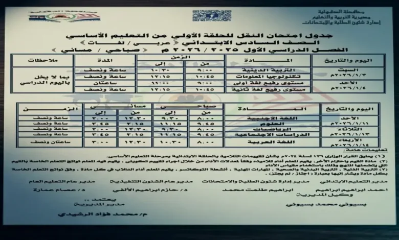 ستقوم المديريات التعليمية في كل محافظة بإعداد جداول امتحانات تضمن توزيع المواد بشكل متوازن، مع توفير فواصل زمنية مناسبة. وذلك سيمكن الطلاب وأولياء الأمور من وضع خطط مذاكرة فعالة ومريحة. في المقابل، يخضع الصفان الأول والثاني الابتدائي لنظام تقييم مستمر بدلاً من الامتحانات التقليدية، حيث تُحدد مواعيد التقييم على مرحلتين: تقييم مبدئي من 20 إلى 22 أبريل 2026، وتقييم نهائي من 11 إلى 13 مايو 2026.